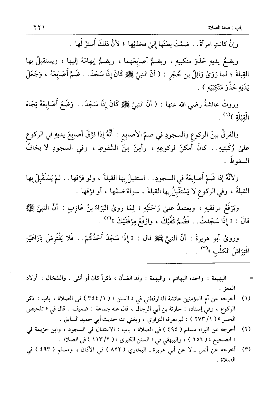 وروت عائشة - رَضِيَ اللَّهُ عَنْهَا -: «أن النبي - صَلَّى اللَّهُ عَلَيْهِ وَسَلَّمَ - كان إذا سجد. . وضع أصابعه تجاه القبلة» .
