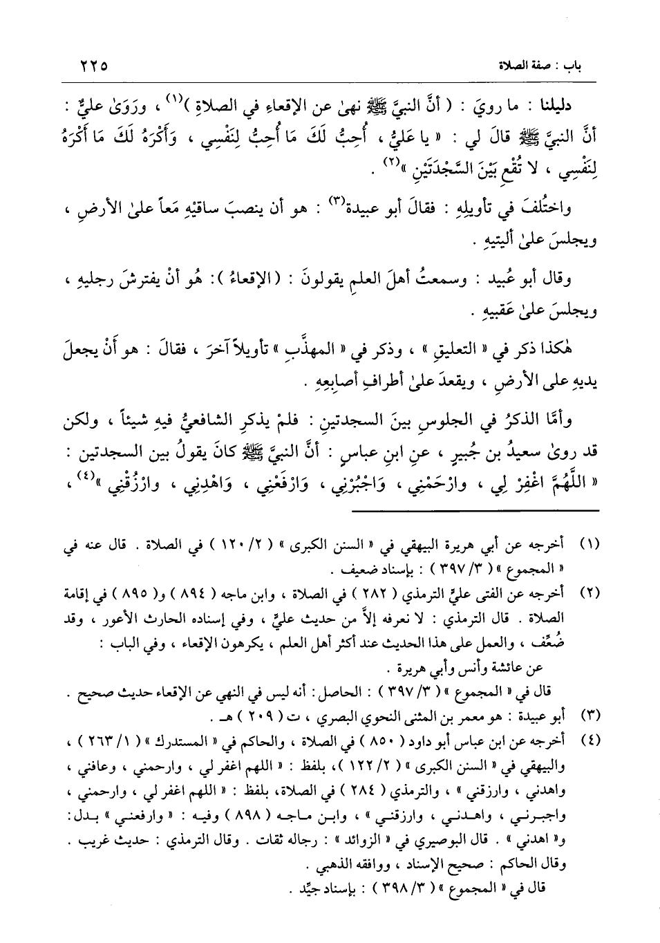 دليلنا: ما روي: «أن النبي - صَلَّى اللَّهُ عَلَيْهِ وَسَلَّمَ - نهى عن الإقعاء في الصلاة» ، وروى علي: «أن النبي - صَلَّى اللَّهُ عَلَيْهِ وَسَلَّمَ - قال لي: يا علي، أحب لك ما أحب لنفسي، وأكره لك ما أكره لنفسي، لا تقع بين السجدتين» .