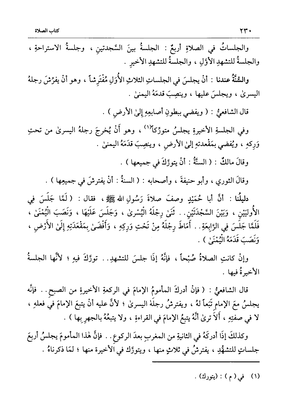وفي الجلسة الأخيرة يجلس متوركا، وهو أن يخرج رجله اليسرى من تحت وركه، ويفضي بمقعدته إلى الأرض، وينصب قدمه اليمنى.