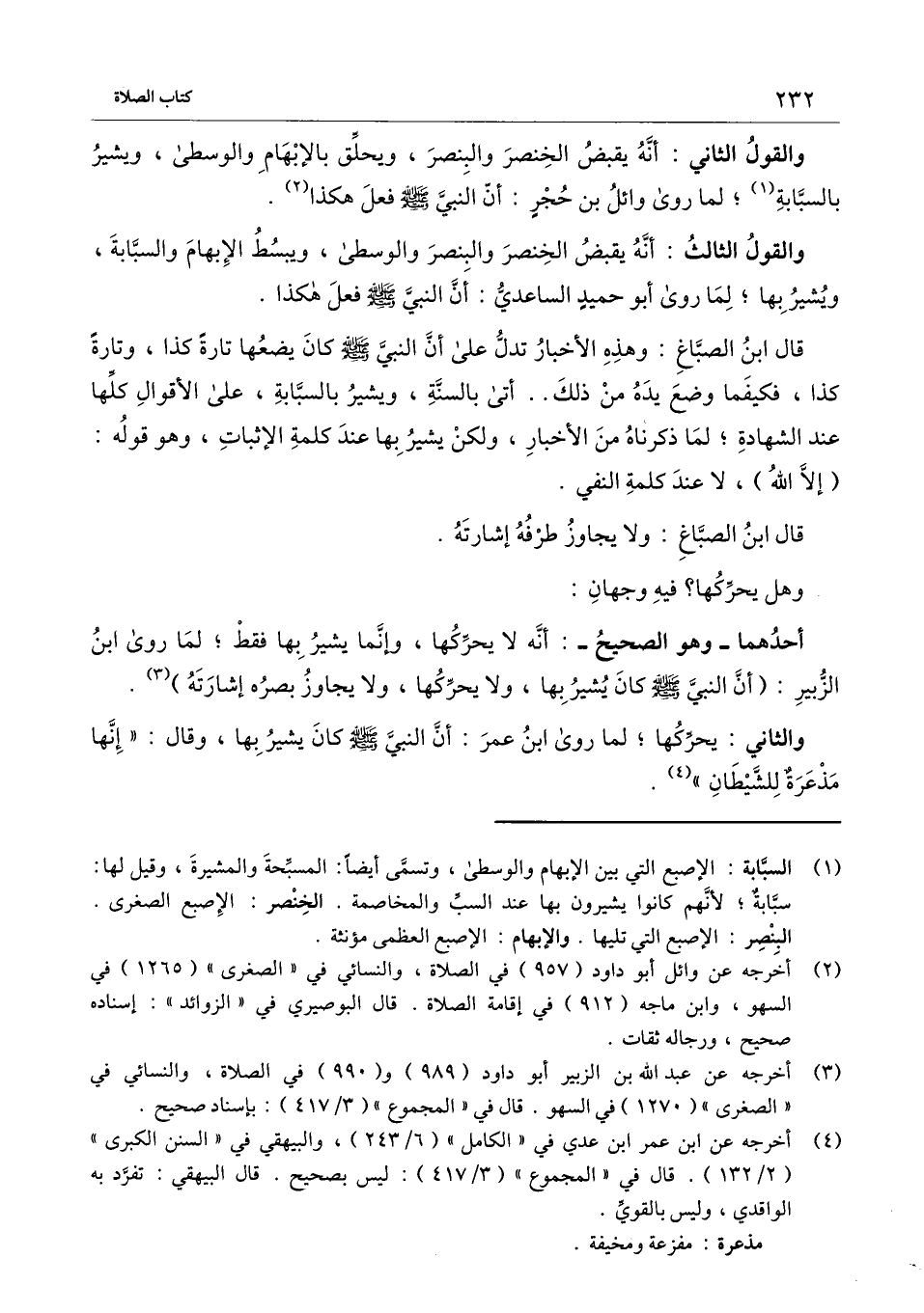 والقول الثالث: أنه يقبض الخنصر والبنصر والوسطى، ويبسط الإبهام والسبابة، ويشير بها؛ لما روى أبو حميد الساعدي: أن النبي - صَلَّى اللَّهُ عَلَيْهِ وَسَلَّمَ - فعل هكذا.