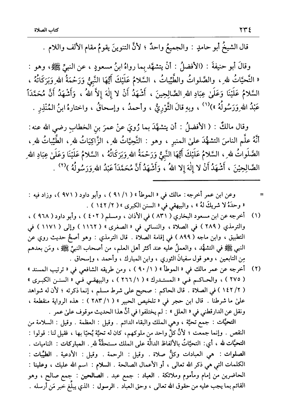 وقال أبو حنيفة: (الأفضل: أن يتشهد بما رواه ابن مسعود، عن النبي - صَلَّى اللَّهُ عَلَيْهِ وَسَلَّمَ - وهو: «التحيات لله، والصلوات والطيبات، السلام عليك أيها النبي ورحمة الله وبركاته، السلام علينا وعلى عباد الله الصالحين، أشهد أن لا إله إلا الله وأشهد أن محمدًا عبد الله ورسوله» ، وبه قال الثوري، وأحمد، وإسحاق، واختاره ابن المنذر.