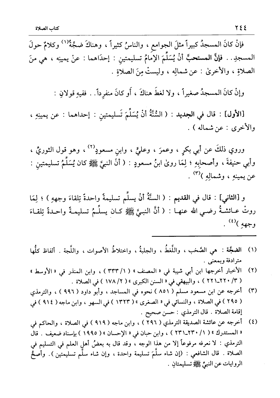 فإن كان المسجد كبيرًا مثل الجوامع، والناس كثيرًا، وهناك ضجة وكلام حول المسجد. . فإن المستحب أن يسلم الإمام تسليمتين: إحداهما: عن يمينه، هي من الصلاة، والأخرى: عن شماله، وليست من الصلاة.