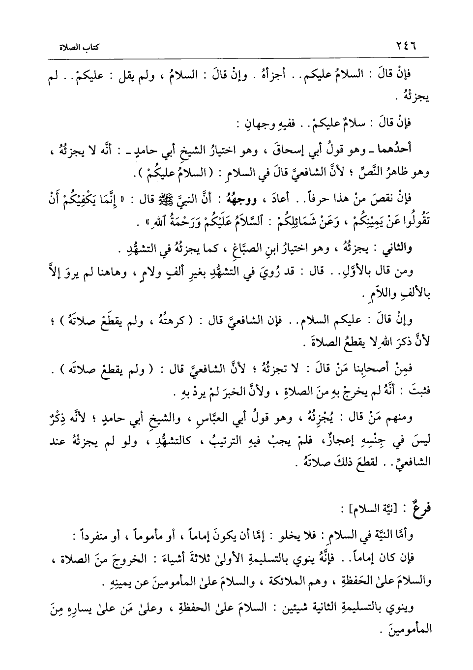 وأما النية في السلام: فلا يخلو: إما أن يكون إمامًا، أو مأمومًا، أو منفردًا: