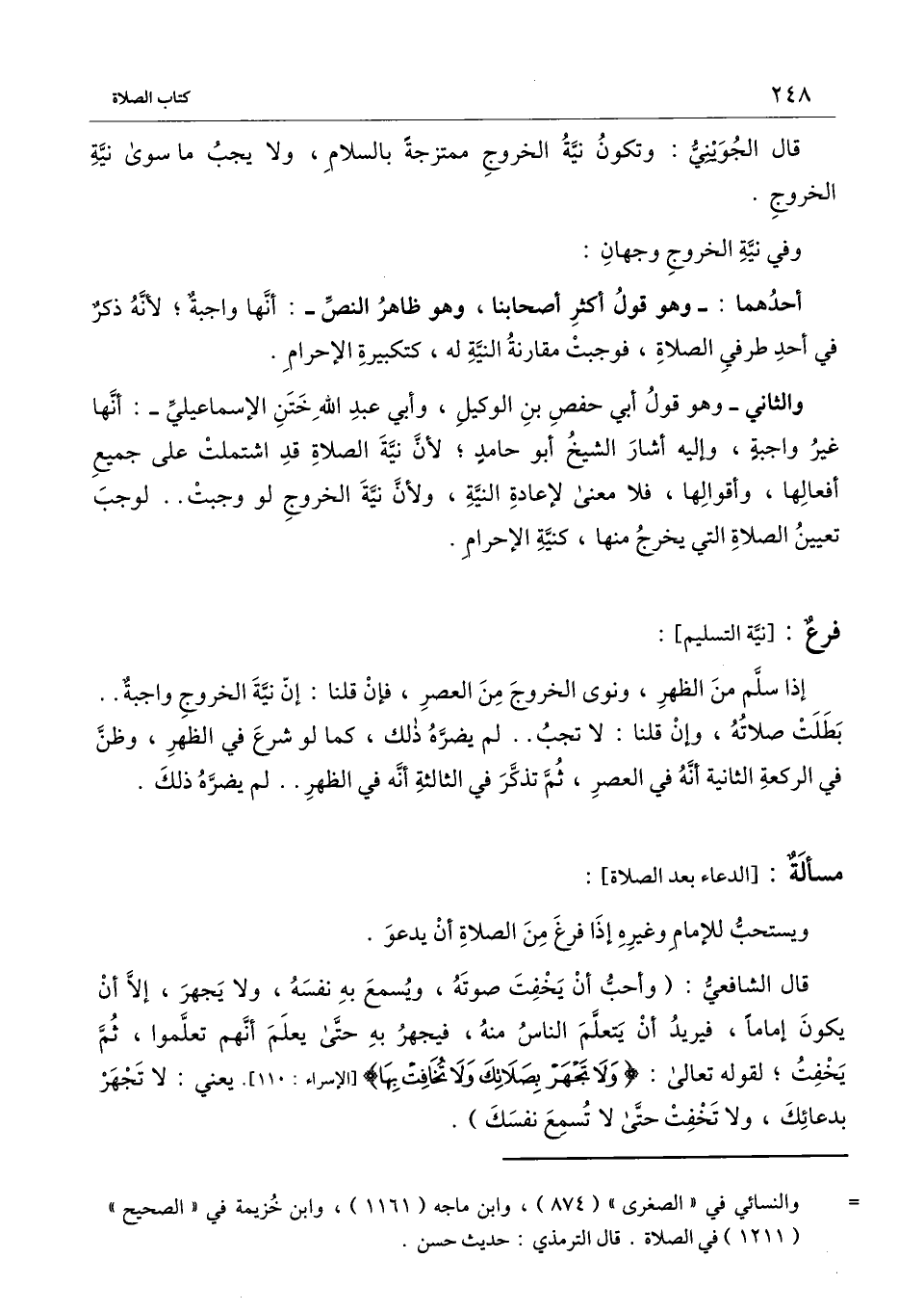 والثاني - وهو قول أبي حفص بن الوكيل، وأبي عبد الله ختن الإسماعيلي -: أنها غير واجبة، وإليه أشار الشيخ أبو حامد؛ لأن نية الصلاة قد اشتملت على جميع أفعالها، وأقوالها، فلا معنى لإعادة النية، ولأن نية الخروج لو وجبت. . لوجب تعيين الصلاة التي يخرج منها، كنية الإحرام.