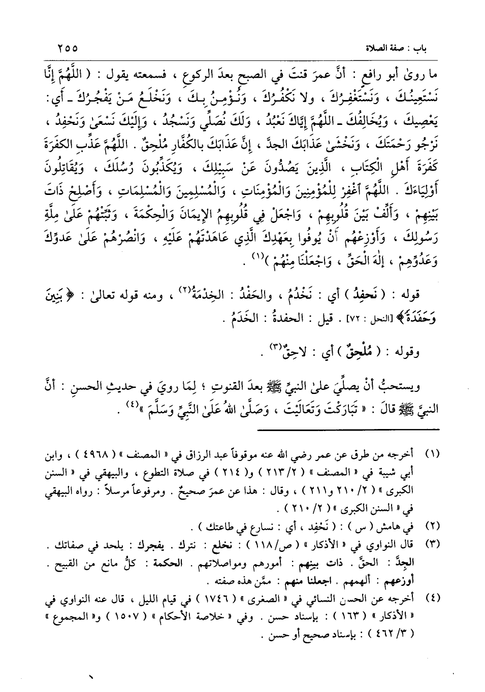 ما روى أبو رافع: أن عمر قنت في الصبح بعد الركوع، فسمعته يقول: (اللهم إنا نستعينك، ونستغفرك، ولا نكفرك، ونؤمن بك، ونخلع من يفجرك - أي: يعصيك، ويخالفك - اللهم إياك نعبد، ولك نصلي ونسجد، وإليك نسعى ونحفد، نرجو رحمتك، ونخشى عذابك الجد، إن عذابك بالكفار ملحق. اللهم عذِّب الكفرة كفرة أهل الكتاب، الذين يصدون عن سبيلك، ويكذبون رسلك، ويقاتلون أولياءك. اللهم اغفر للمؤمنين والمؤمنات، والمسلمين والمسلمات، وأصلح ذات بينهم، وألف بين قلوبهم، واجعل في قلوبهم الإيمان والحكمة، وثبتهم على ملة رسولك، وأوزعهم أن يوفوا بعهدك الذي عاهدتهم عليه، وانصرهم على عدوك وعدوهم: إله الحق، واجعلنا منهم) .
