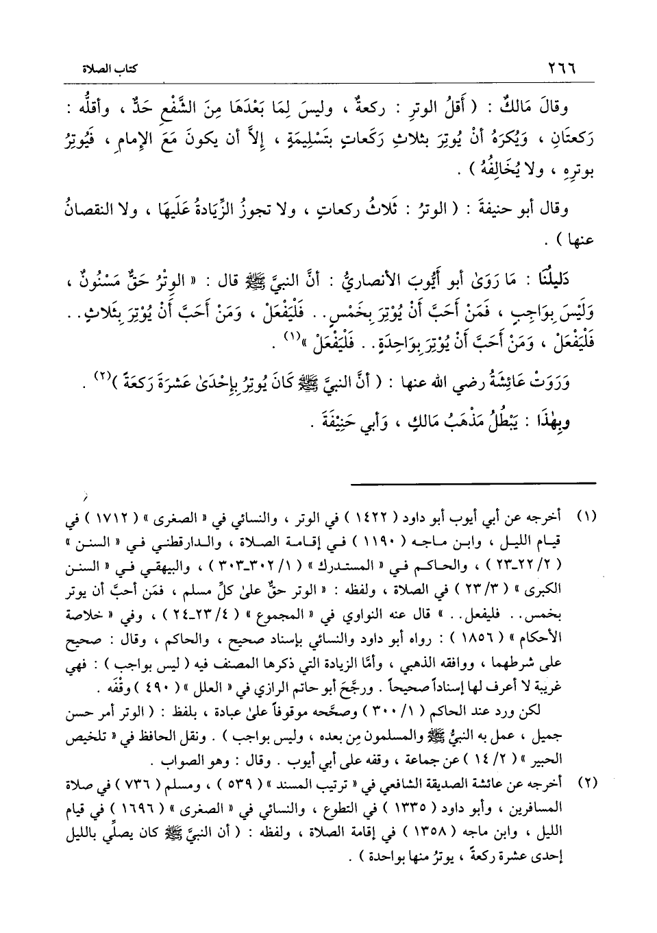 وقال أبو حنيفة: (الوتر: ثلاث ركعات، ولا تجوز الزيادة عليها، ولا النقصان عنها) .