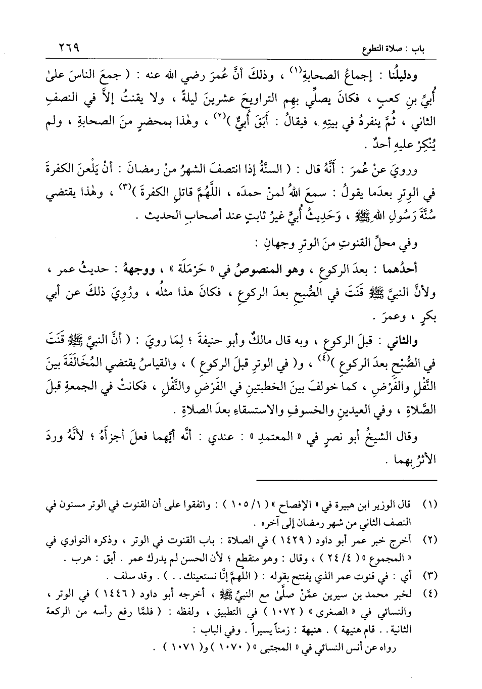 وروي «عن عمر: أنه قال: (السنة إذا انتصف الشهر من رمضان: أن يلعن الكفرة في الوتر بعدما يقول: سمع الله لمن حمده، اللهم قاتل الكفرة» ، وهذا يقتضي سنة رسول الله - صَلَّى اللَّهُ عَلَيْهِ وَسَلَّمَ -، وحديث أبي غير ثابت عند أصحاب الحديث.