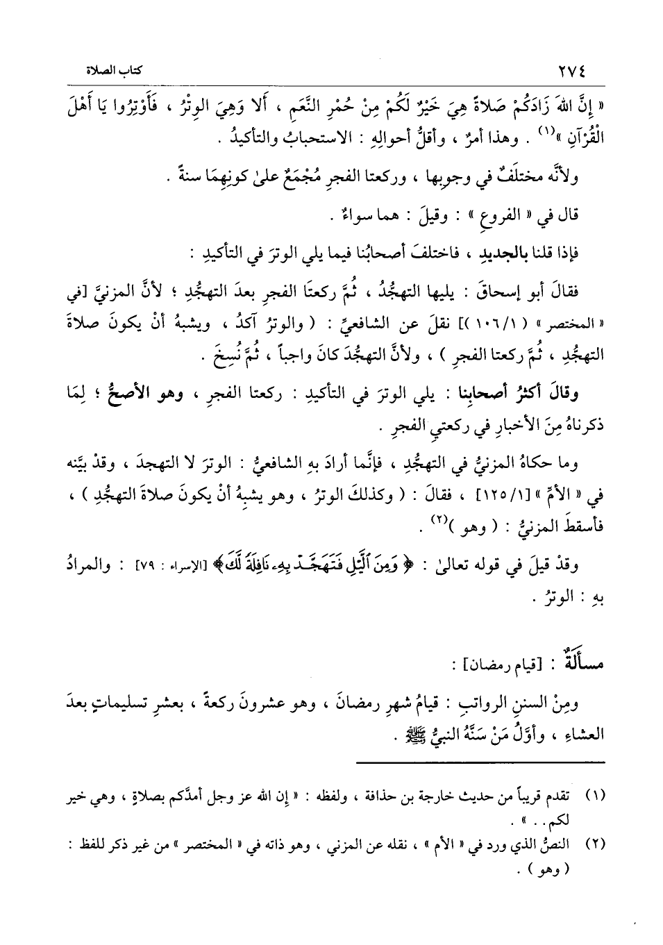 وما حكاه المزني في التهجد، فإنما أراد به الشافعي: الوتر لا التهجد، وقد بينه في " الأم " [1 125] ، فقال: (وكذلك الوتر، وهو يشبه أن يكون صلاة التهجد) . فأسقط المزني: (وهو) .