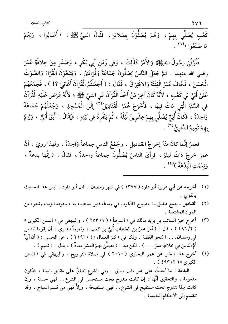 فتوفي رسول الله - صَلَّى اللَّهُ عَلَيْهِ وَسَلَّمَ - والأمر كذلك، وفي زمن أبي بكر، وصدر من خلافه عمر - رَضِيَ اللَّهُ عَنْهُمَا -. ثم جعل الناس يصلون جماعة وفرادى، ويتبعون القراء والصوت الحسن، فخاف عمر الفتنة والافتراق، فقال: (أجعلتم القرآن أغاني؟ !) ، فجمعهم على أبي بن كعب؛ لأنه كان آخر من أخذ القرآن عن النبي - صَلَّى اللَّهُ عَلَيْهِ وَسَلَّمَ -؛ لأنه عرض عليه القرآن في السنة التي مات فيها، فأخرج عمر القناديل إلى المسجد، وجعلهم جماعة واحدة، فكان أبي يصلي بهم عشرين ليلة، ثم ينفرد في بيته، فيقال: ابق أبي، ويتم بهم تميم الداري.