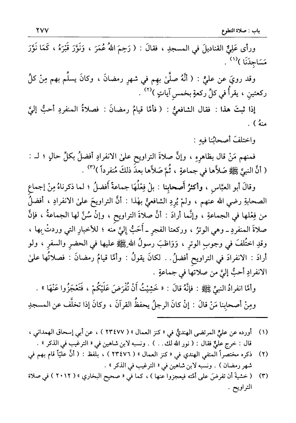 وقال أبو العباس وأكثر أصحابنا: بل فعلها جماعة أفضل؛ لما ذكرناه من إجماع الصحابة - رَضِيَ اللَّهُ عَنْهُمْ -، ولم يرد الشافعي بهذا: أن التراويح على الانفراد، أفضل من فعلها في الجماعة، وإنما أراد: أن صلاة التراويح، وإن سن لها الجماعة، فإن صلاة المنفرد - وهي الوتر، وركعتا الفجر - أحب إلي منه؛ للأخبار التي وردت بها، وقد اختلف في وجوب الوتر، وواظب رسول الله - صَلَّى اللَّهُ عَلَيْهِ وَسَلَّمَ - عليها في الحضر والسفر، ولو أراد: الانفراد في التراويح أفضل. . لكان يقول: وأما قيام رمضان: فصلاتها على الانفراد أحب إلي من صلاتها في جماعة.