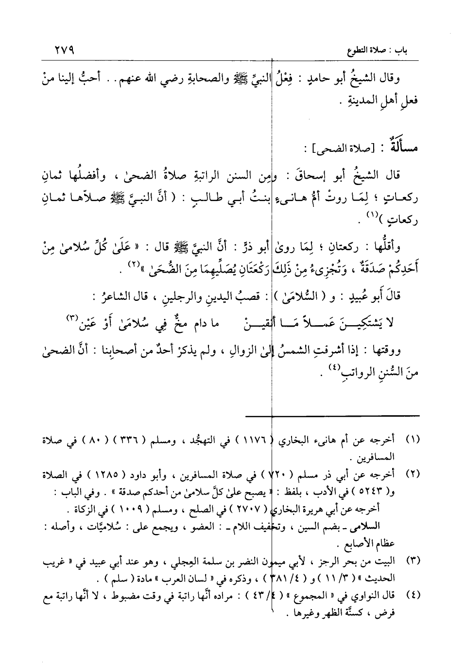قال الشيخ أبو إسحاق: ومن السنن الراتبة صلاة الضحى، وأفضلها ثمان ركعات؛ لما روت أم هانئ بنت أبي طالب: «أن النبي - صَلَّى اللَّهُ عَلَيْهِ وَسَلَّمَ - صلاها ثمان ركعات» .