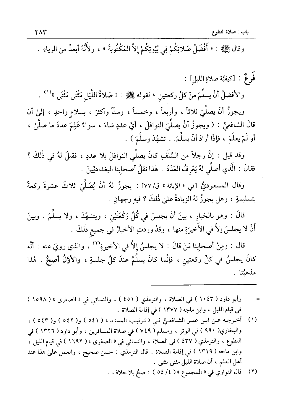 قال: وهو بالخيار بين أن يجلس في كل ركعتين، ويتشهد ولا يسلم، وبين أن لا يجلس إلا في الأخيرة منها، وقد وردت الأخبار في جميع ذلك.