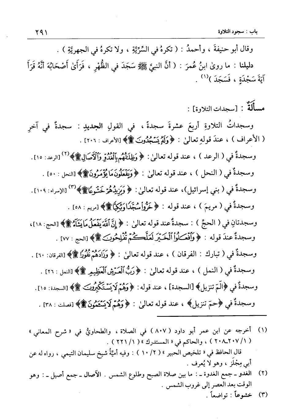 وسجدات التلاوة أربع عشرة سجدة، في القول الجديد: سجدةٌ في آخر (الأعراف) ، عند قَوْله تَعَالَى: {وَلَهُ يَسْجُدُونَ} [الأعراف: 206] [الأعراف: 206] .