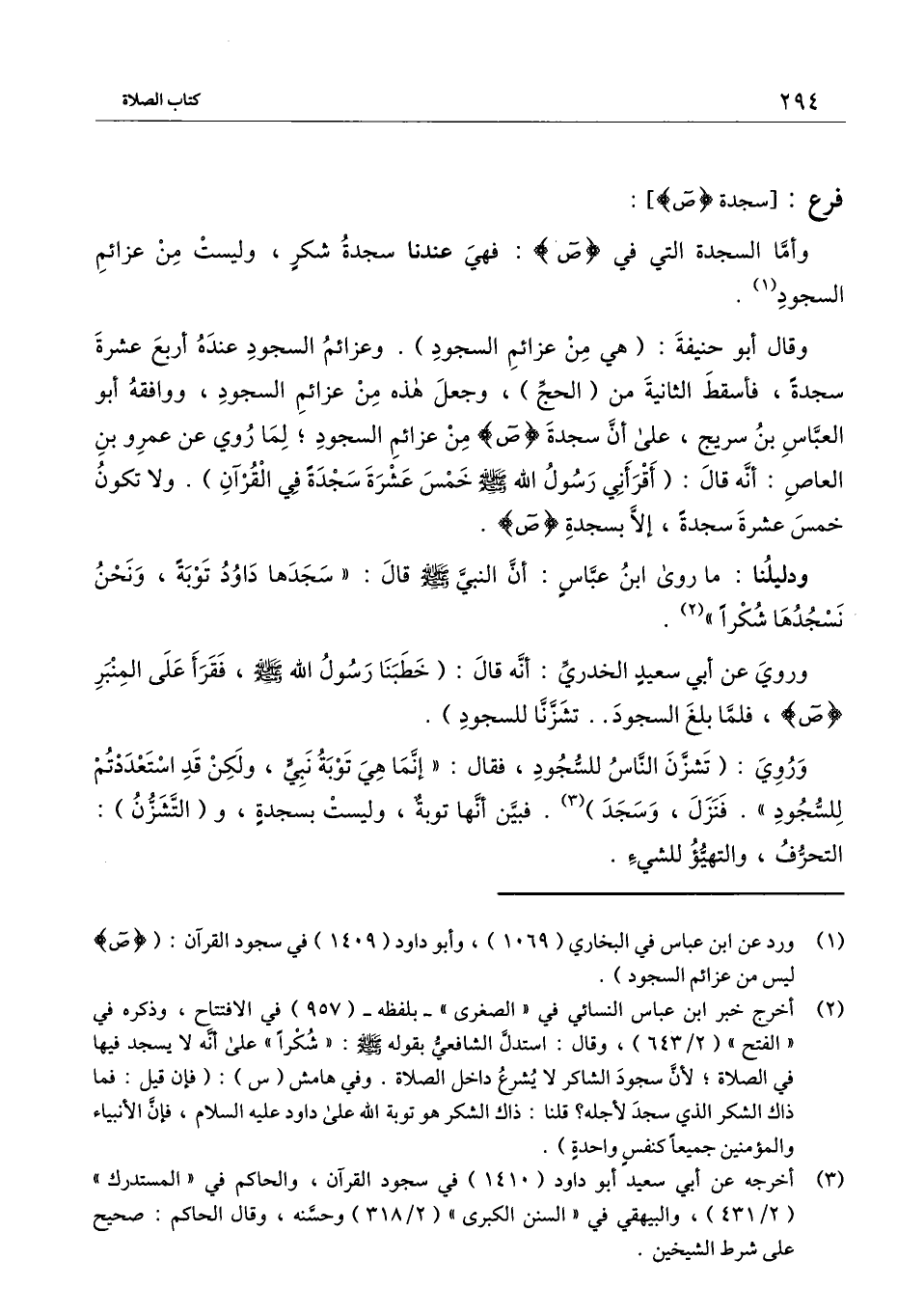 ] : وأما السجدة التي في ص: فهي عندنا سجدة شكر، وليست من عزائم السجود.
