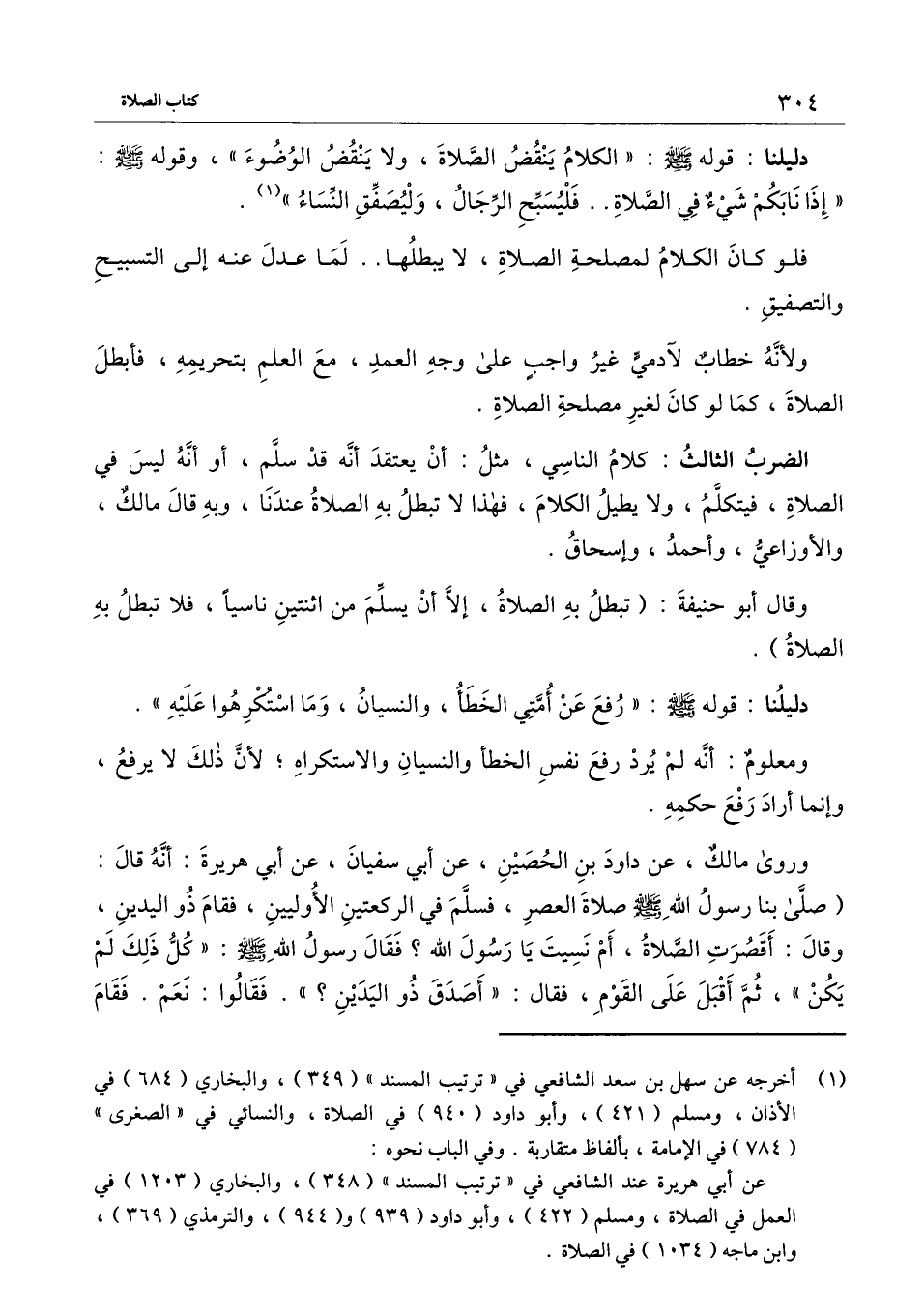 دليلنا: قوله - صَلَّى اللَّهُ عَلَيْهِ وَسَلَّمَ -: «الكلام ينقض الصلاة، ولا ينقض الوضوء» ، وقوله - صَلَّى اللَّهُ عَلَيْهِ وَسَلَّمَ -: «إذا نابكم شيء في الصلاة. . فليسبح الرِّجال، وليصفق النساء» .