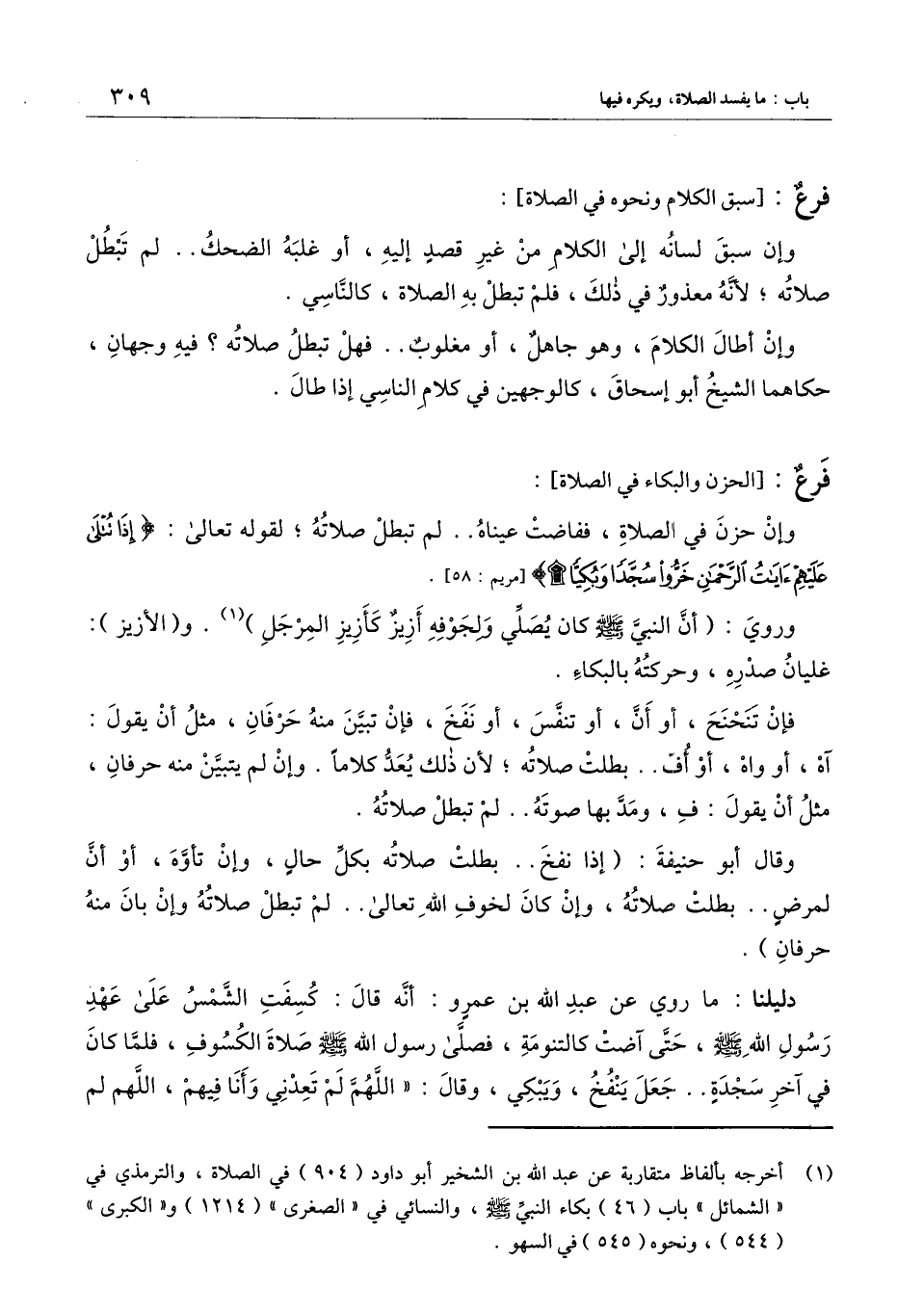 وقال أبو حنيفة: (إذا نفخ. . بطلت صلاته بكل حالٍ، وإن تأوَّه، أو أَنَّ لمرضٍ. . بطلت صلاته، وإن كان لخوف الله تعالى. . لم تبطل صلاته وإن بان منه حرفان) .