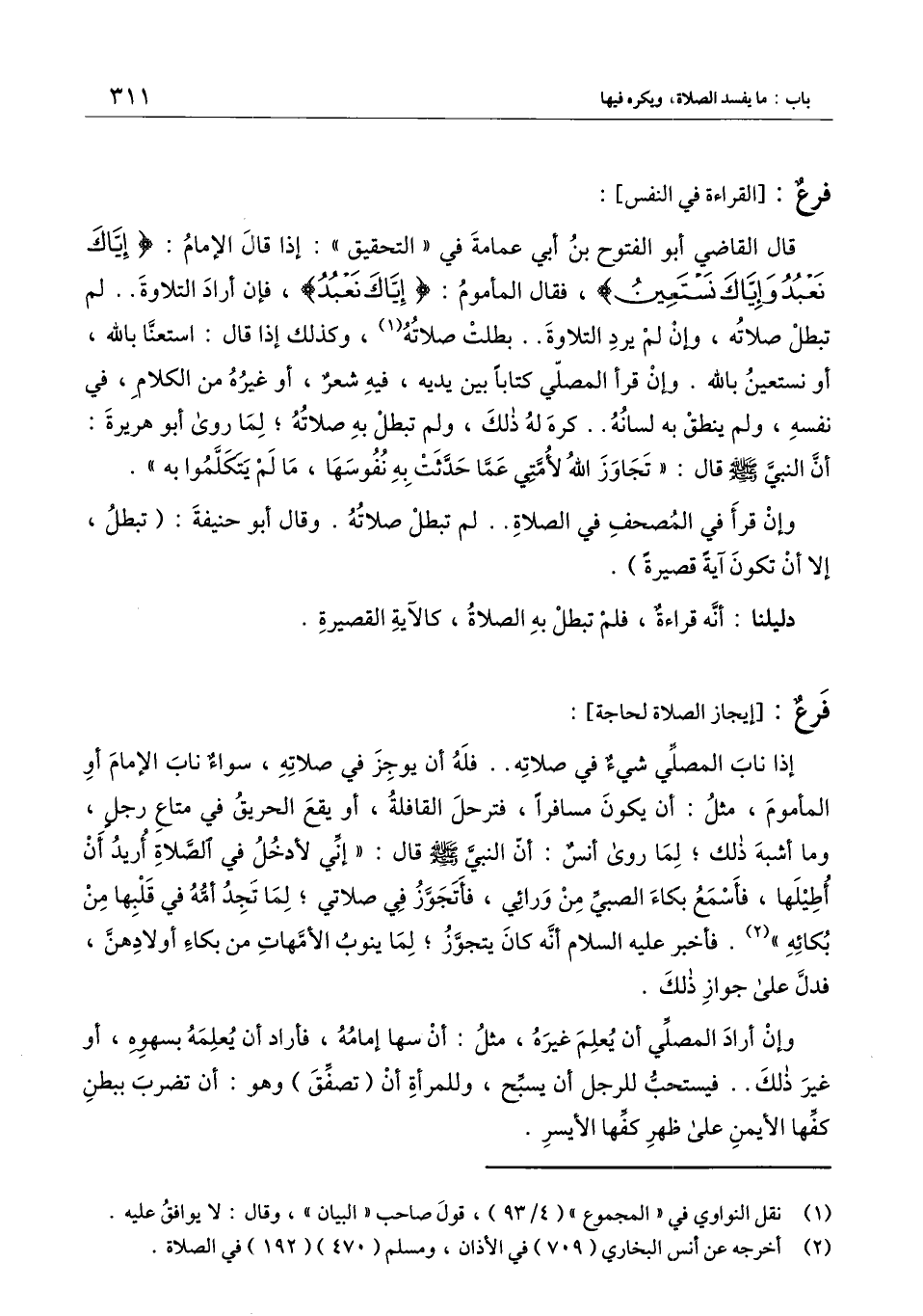 ] : قال القاضي أبو الفتوح بن أبي عمامة في " التحقيق ": إذا قال الإمام: {إِيَّاكَ نَعْبُدُ وَإِيَّاكَ نَسْتَعِينُ} [الفاتحة: 5] ، فقال المأموم: {إِيَّاكَ نَعْبُدُ} [الفاتحة: 5] ، فإن أراد التلاوة. . لم تبطل صلاته، وإن لم يرد التلاوة. . بطلت صلاته، وكذلك إذا قال: استعنَّا بالله، أو: نستعين بالله. وإن قرأ المصلّي كتابًا بين يديه، فيه شعرٌ، أو غيره من الكلام، في نفسه، ولم ينطق به لسانه. . كره له ذلك، ولم تبطل به صلاته؛ لما روى أبو هريرة: أن النبي - صَلَّى اللَّهُ عَلَيْهِ وَسَلَّمَ - قال: «تجاوز الله لأُمتي عما حدَّثت به نفوسها، ما لم يتكلّموا به» .