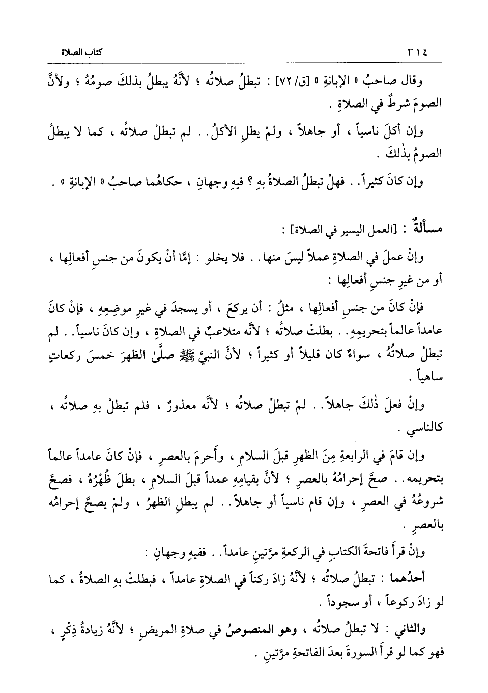وإن كان كثيرًا , فهل تبطل الصلاة به؟ فيه وجهان، حكاهما صاحب " الإبانة ".
