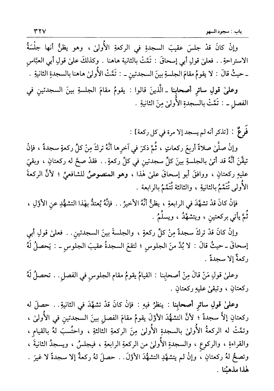 ] : وإن صلَّى صلاة أربع ركعات، ثم ذكر في آخرها أنه ترك من كل ركعة سجدة، فإن تيقن أنه قد أتى بالجلسة بين كل سجدتين في كل ركعة. . فقد صحَّ له ركعتان، وبقي عليه ركعتان ووافق أبو إسحاق على هذا، وهو المنصوص للشافعي؛ لأنَّ الركعة الأولى تتم بالثانية، والثالثة تتمم بالرابعة.