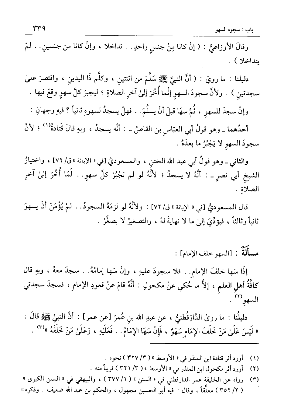 ] : إذا سها خلف الإمام. . فلا سجود عليه، وإن سها إمامه. . سجد معه، وبه قال كافة أهل العلم، إلا ما حُكي عن مكحول: أنه قام عن قعود الإمام، فسجد سجدتي السهو.