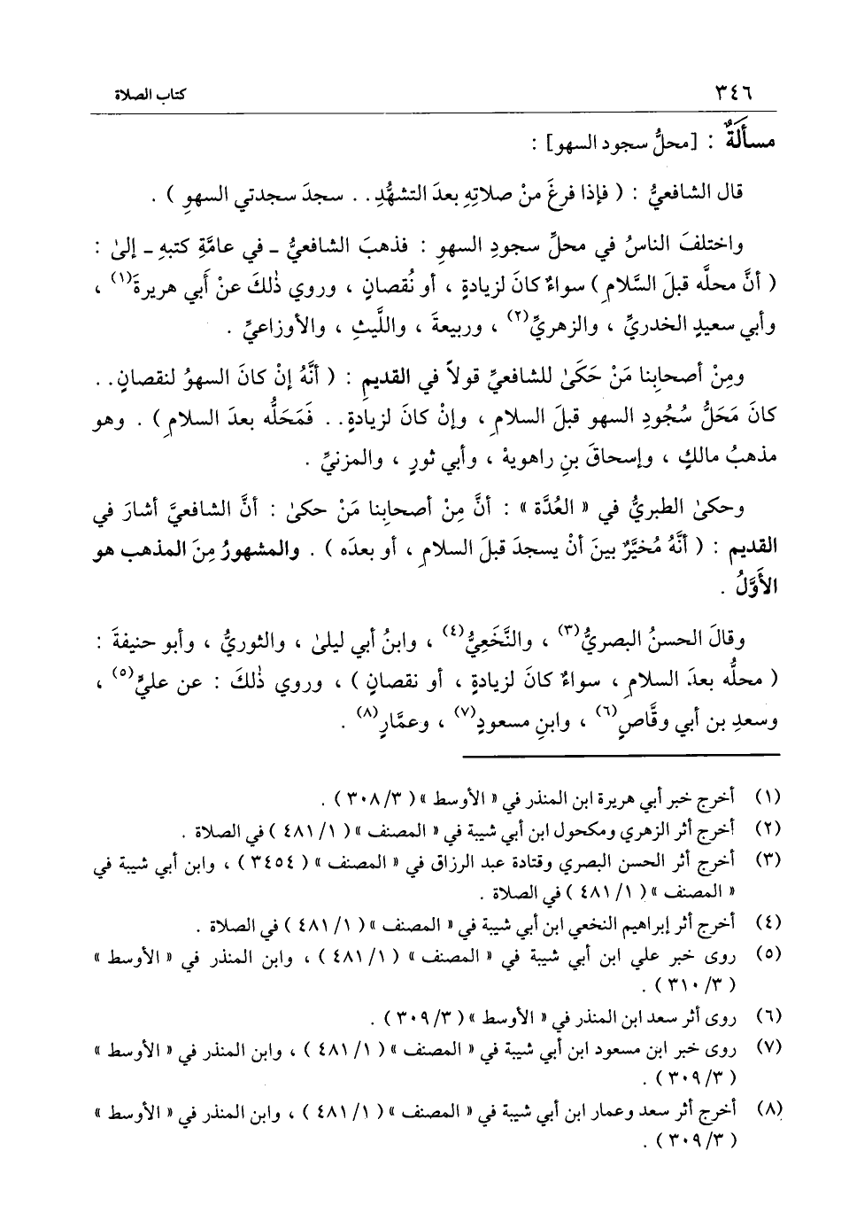 واختلف الناس في محل سجود السهو: فذهب الشافعي في عامة كتبه إلى: (أن محلَّه قبل السلام) سواءٌ كان لزيادة، أو نقصان، وروي ذلك عن أبي هريرة , وأبي سعيد الخدري، والزهري، وربيعة، والليث، والأوزاعي.
