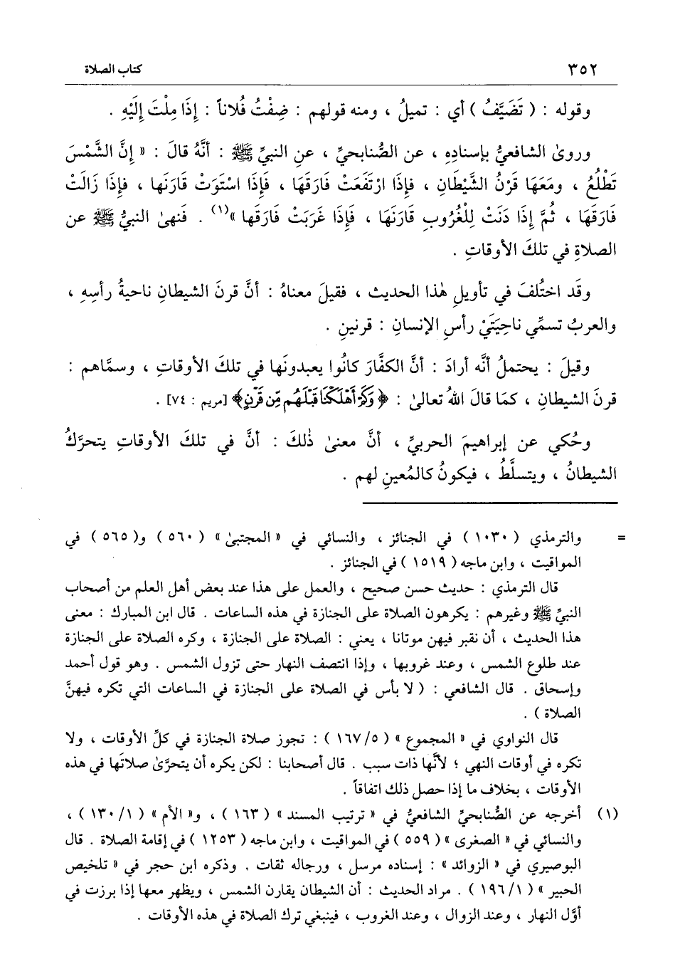 وروى الشافعي بإسناده، عن الصنابحي، عن النبي - صَلَّى اللَّهُ عَلَيْهِ وَسَلَّمَ -: أنه قال: «إن الشمس تطلع، ومعها قرن الشيطان، فإذا ارتفعت فارقها، فإذا استوت قارنها، فإذا زالت فارقها، ثم إذا دنت للغروب قارنها، فإذا غربت فارقها» . فنهى النبي - صَلَّى اللَّهُ عَلَيْهِ وَسَلَّمَ - عن الصلاة في تلك الأوقات.