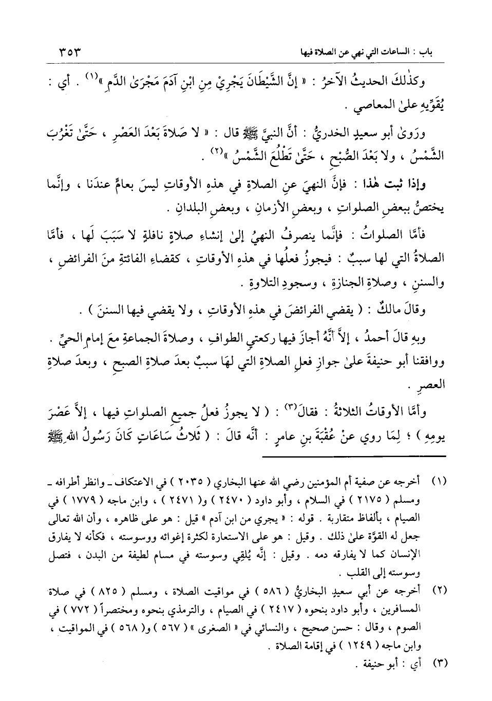 وروى أبو سعيد الخدري: أن النبي - صَلَّى اللَّهُ عَلَيْهِ وَسَلَّمَ - قال: «لا صلاة بعد العصر، حتى تغرب الشمس، ولا بعد الصبح، حتى تطلع الشمس» .