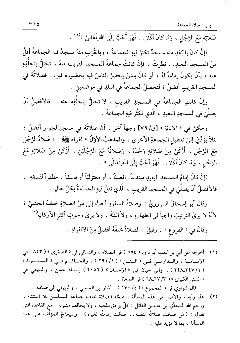 وحكى في " الإبانة " [ق 79] وجهًا آخر: أن صلاته في مسجد الجوار أفضل؛ لئلا يؤدي إلى تعطيل الجماعة الأخرى، والمذهب الأول، لقوله - صَلَّى اللَّهُ عَلَيْهِ وَسَلَّمَ -: «صلاة الرجل مع الرجل، أزكى من صلاته وحده، وصلاته مع الرجلين، أزكي من صلاته مع الرجل، وما كان أكثر. . فهو أحب إلى الله تعالى» .
