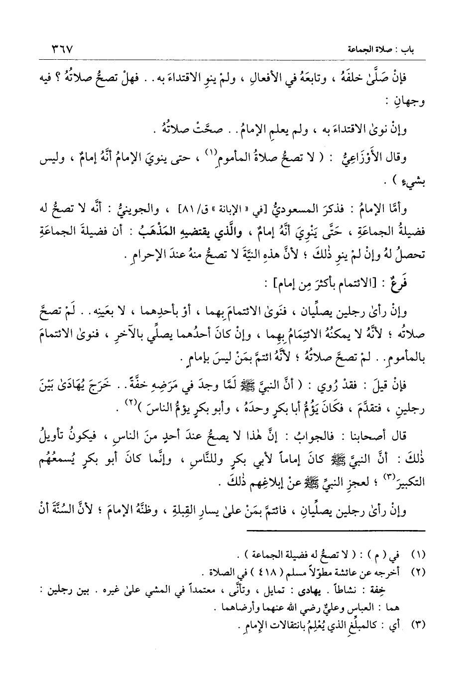 وإن رأى رجلين يصلِّيان، فنوى الائتمام بهما، أو بأحدهما، لا بعينه. . لم تصحَّ صلاته؛ لأنه لا يمكنه الائتمام بهما، وإن كان أحدهما يصلِّي بالآخر فنوى الائتمام بالمأموم. . لم تصحَّ صلاته؛ لأنه ائتم بمن ليس بإمام.