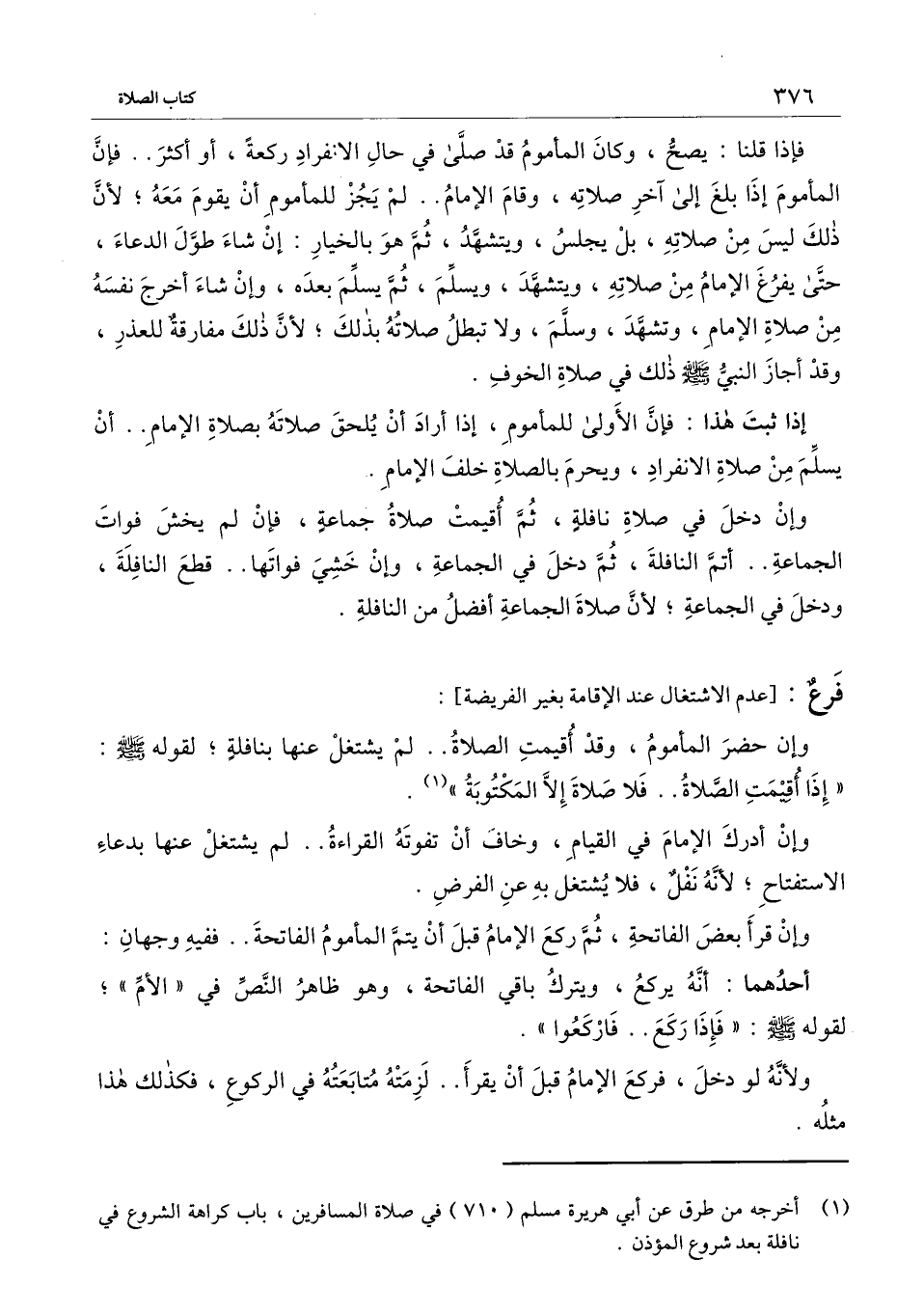 ] : وإن حضر المأموم، وقد أُقيمت الصلاة. . لم يشتغل عنها بنافلة؛ لقوله - صَلَّى اللَّهُ عَلَيْهِ وَسَلَّمَ -: «إذا أُقيمت الصلاة. . فلا صلاة إلا المكتوبة» .