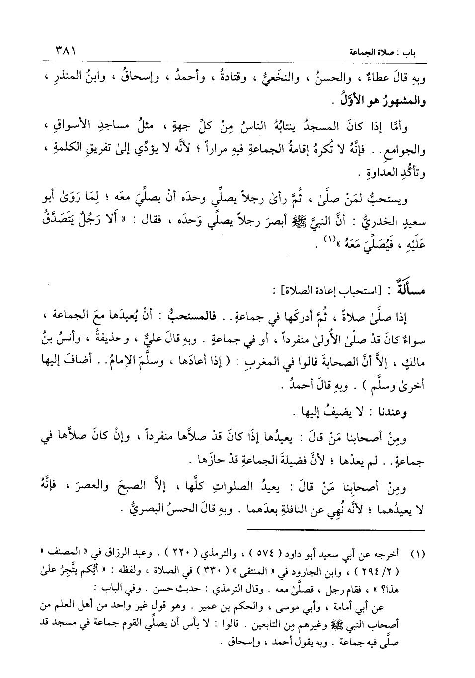 ويستحب لمن صلَّى ثم رأى رجلاً يصلِّي وحده أن يصلِّي معه؛ لما روى أبو سعيد الخدري: أن النبي - صَلَّى اللَّهُ عَلَيْهِ وَسَلَّمَ - أبصر رجلاً يصلِّي وحده، فقال: «ألا رجلٌ يتصدق عليه، فيصلي معه» .