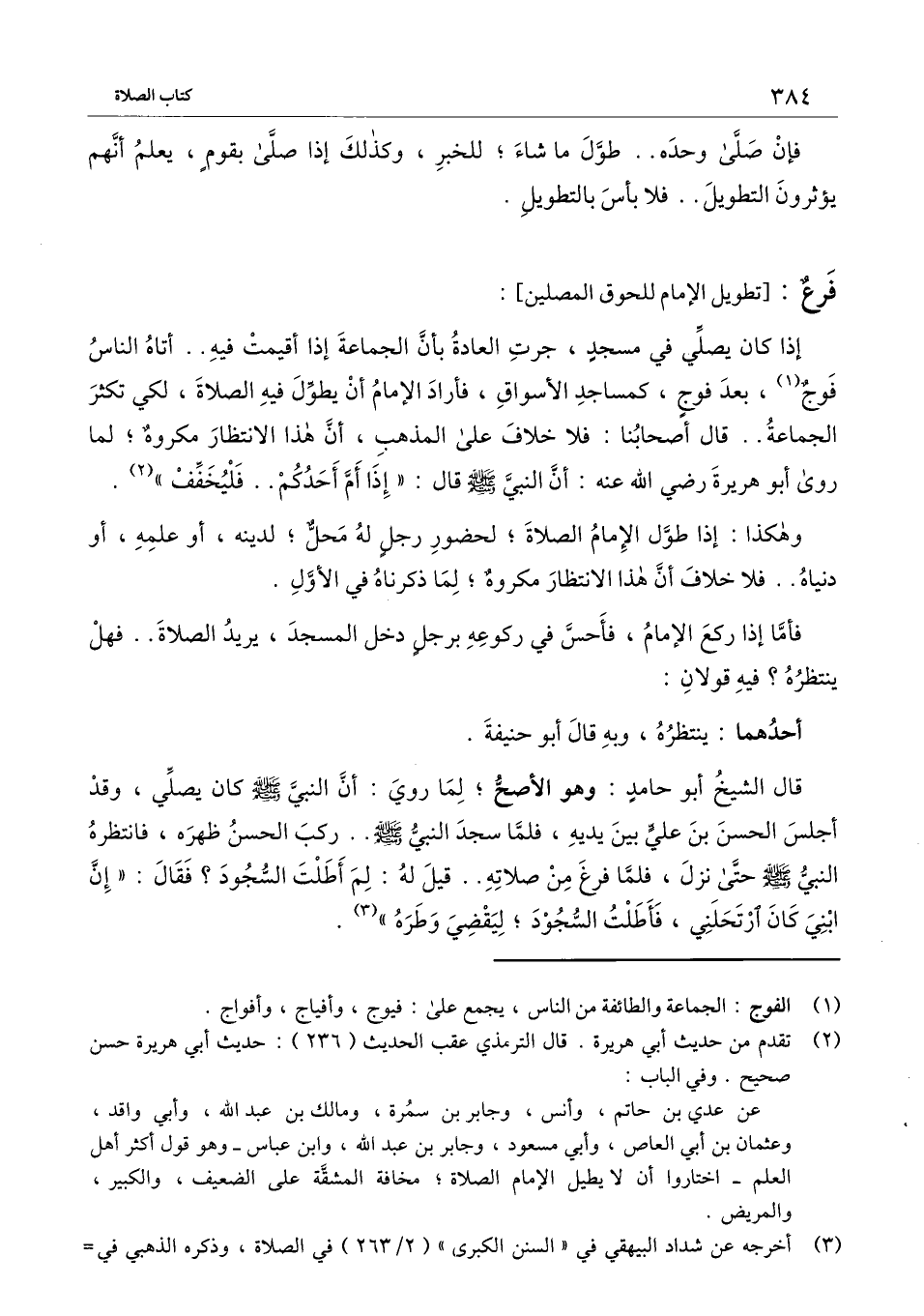 إذا كان يصلِّي في مسجد، جرت العادة بأن الجماعة إذا أقيمت فيه. . أتاه الناس فوجٌ بعد فوج، كمساجد الأسواق، فأراد الإمام أن يطول فيه الصلاة لكي تكثر الجماعة.. قال أصحابنا: فلا خلاف على المذهب أن هذا الانتظار مكروه؛ لما روى أبو هريرة - رَضِيَ اللَّهُ عَنْهُ -: أن النبي - صَلَّى اللَّهُ عَلَيْهِ وَسَلَّمَ - قال: «إذا أمَّ أحدكم. . فليُخفف» .