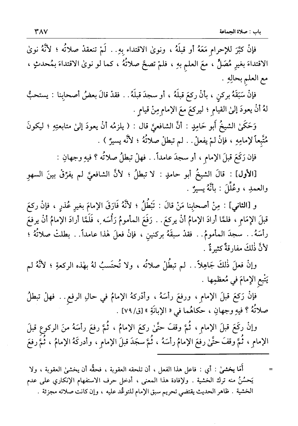 و [الثاني] : من أصحابنا من قال: تبطل؛ لأنه فارق الإمام بغير عذر، فإن ركع قبل الإمام، فلمَّا أراد الإمام أن يركع رفع المأموم رأسه، فلمَّا أراد الأمام أن يرفع رأسه سجد المأموم، فقد سبقه بركنين، فإن فعل هذا عامدًا بطلت صلاته؛ لأن ذلك مفارقةٌ كثيرة.