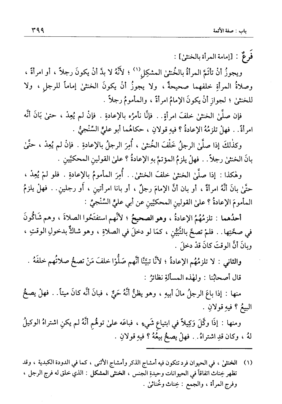 ] : ويجوز أن تأتم المرأة بالخنثى المشكل؛ لأنه لا بد أن يكون رجلًا أو امرأة، وصلاة المرأة خلفهما صحيحة، ولا يجوز أن يكون الخنثى إمامًا للرجل، ولا للخنثى؛ لجواز أن يكون الإمام امرأة، والمأموم رجلًا.