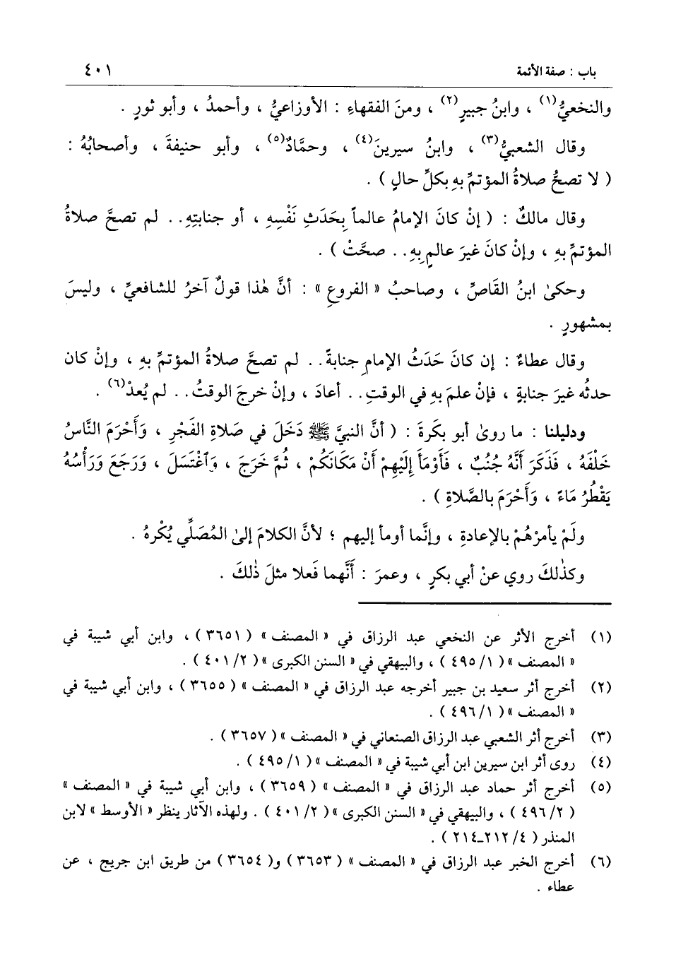 وقال الشعبي، وابن سيرين، وحماد، وأبو حنيفة، وأصحابه: (لا تصح صلاة المؤتم به بكل حال) .