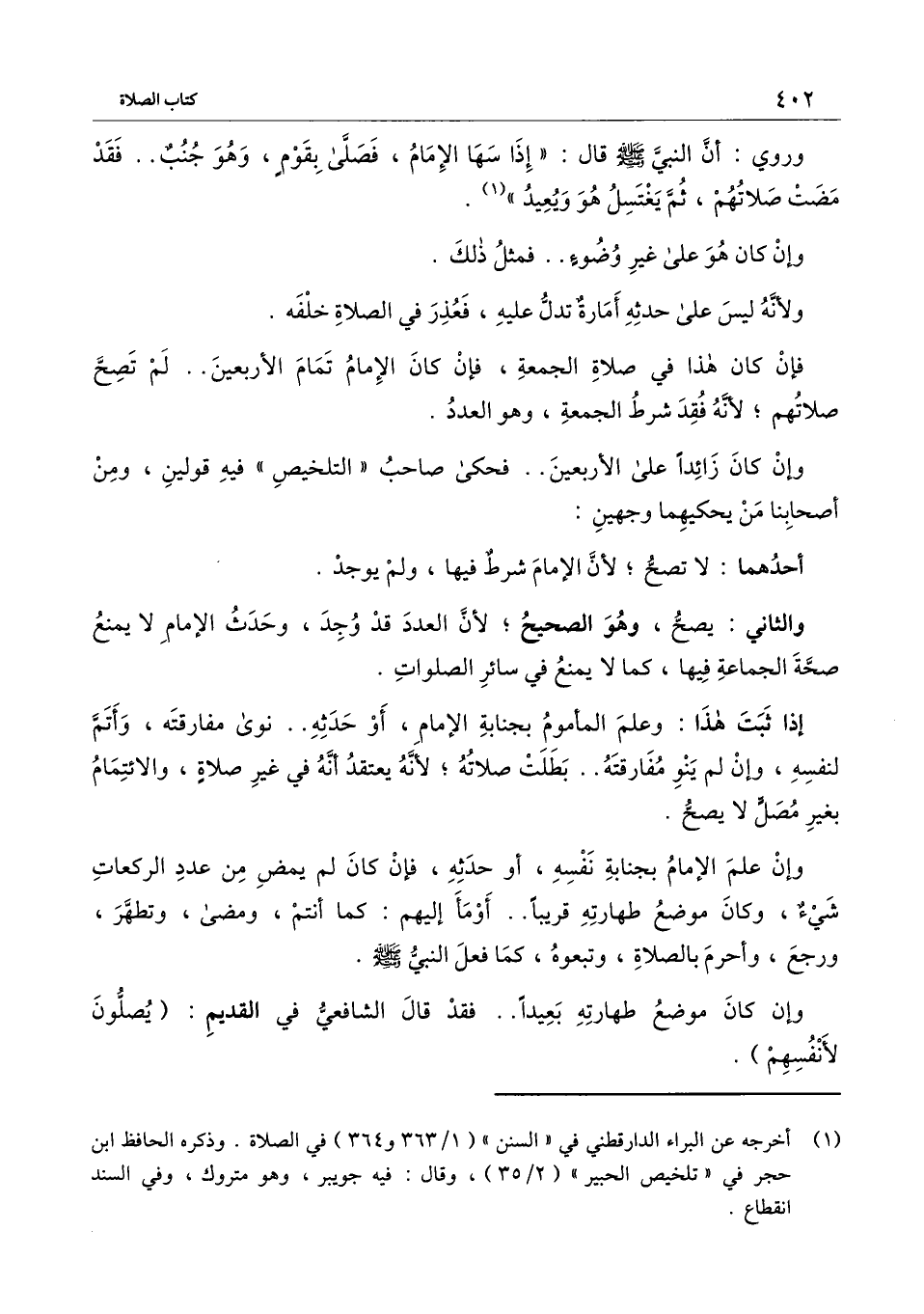 وروي: أن النبي - صَلَّى اللَّهُ عَلَيْهِ وَسَلَّمَ - قال: «إذا سها الإمام، فصلى بقوم، وهو جنب، فقد مضت صلاتهم، ثم يغتسل هو ويعيد» .