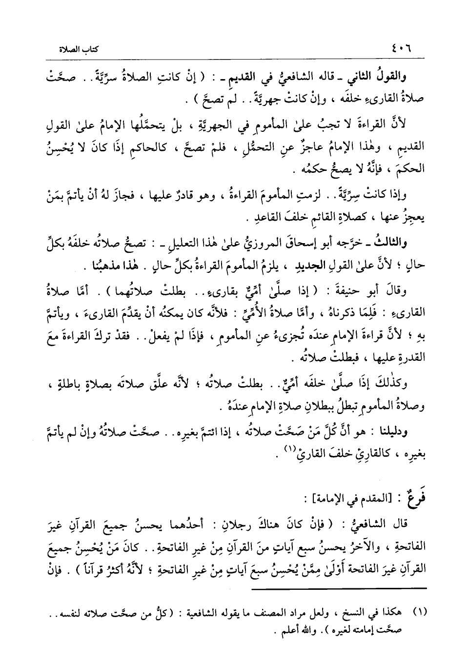والثالث خرجه أبو إسحاق المروزي على هذا التعليل: تصح صلاته خلفه بكل حال؛ لأن على القول الجديد، يلزم المأموم القراءة بكل حال، هذا مذهبنا.
