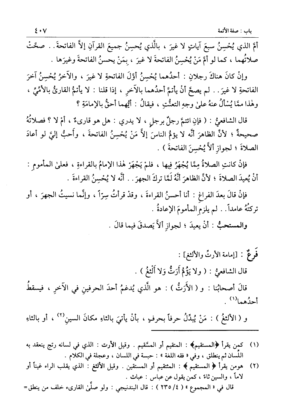 ] : قال الشافعي: (ولا يؤم أرت ولا ألثغ) .