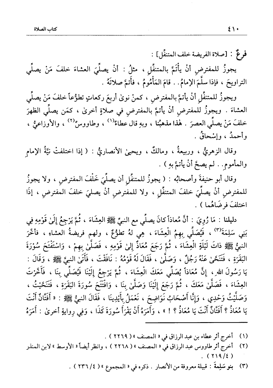 ] : يجوز للمفترض أن يأتم بالمتنفل، مثل: أن يصلي العشاء خلف من يصلي التراويح، فإذا سلم الإمام قام المأموم، فأتم صلاته.