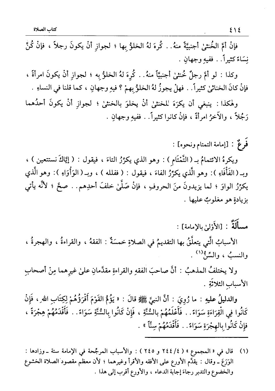 وكذا: لو أمّ رجل خنثى أجنبيًّا منه، كره له الخلو به؛ لجواز أن يكون امرأة، فإن كان الخناثى كثيرًا فهل يجوز له الخلو بهم؟ فيه وجهان، كما قلنا في النساء.