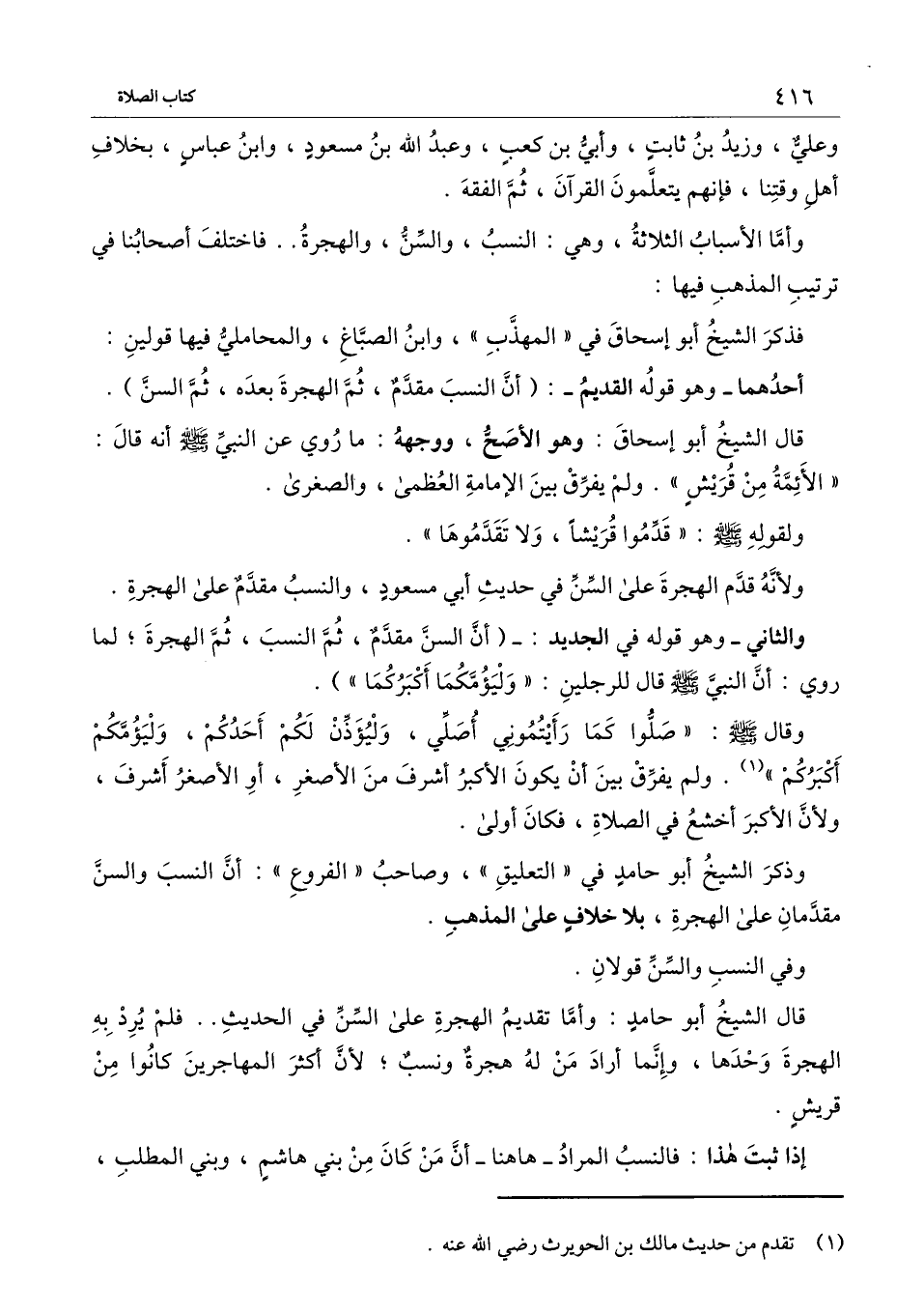 والثاني وهو قوله الجديد: (أن السن مقدم، ثم النسب، ثم الهجرة؛ لما روي: «أن النبي - صَلَّى اللَّهُ عَلَيْهِ وَسَلَّمَ - قال للرجلين: "وليؤمكما أكبركما» .