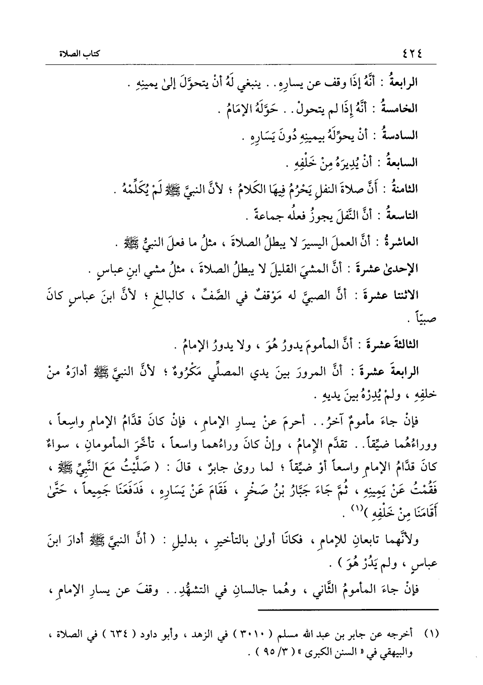فإن جاء مأموم آخر، أحرم عن يسار الإمام، فإن كان قدام الإمام واسعًا ووراءهما ضيقًا، تقدم الإمام، وإن كان وراءهما واسعًا، تأخر المأمومان، سواء كان قدام الإمام واسعًا أو ضيقًا؛ لما روى جابر، قال: «صليت مع النبي - صَلَّى اللَّهُ عَلَيْهِ وَسَلَّمَ -، فقمت عن يمينه، ثم جاء جبار بن صخر، فقام عن يساره، فدفعنا جميعًا، حتى أقامنا من خلفه» .