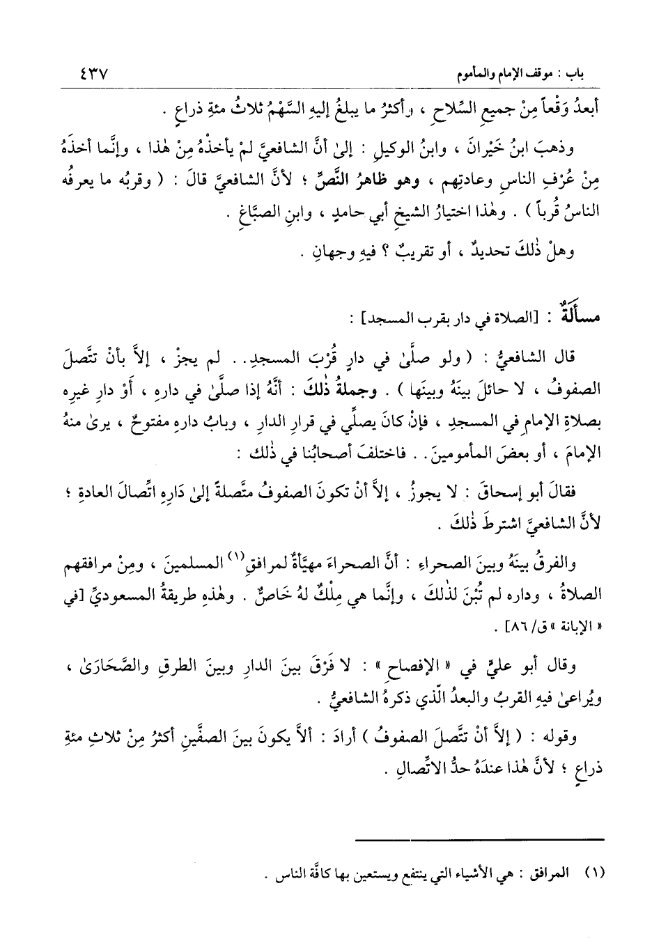 وذهب ابن خيران، وابن الوكيل: إلى أن الشافعي لم يأخذه من هذا، وإنما أخذه من عرف الناس وعادتهم، وهو ظاهر النص؛ لأن الشافعي قال: (وقربه ما يعرفه الناس قربًا) ، وهذا اختيار الشيخ أبي حامد، وابن الصباغ.