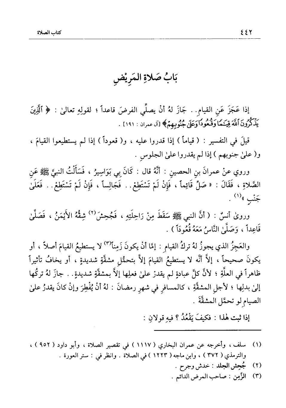 وروي «عن عمران بن الحصين: أنه قال: كان بي بواسير، فسألت النبي - صَلَّى اللَّهُ عَلَيْهِ وَسَلَّمَ - عن الصلاة، فقال: "صل قائمًا، فإن لم تستطع فجالسًا، فإن لم تستطع فعلى جنب» .