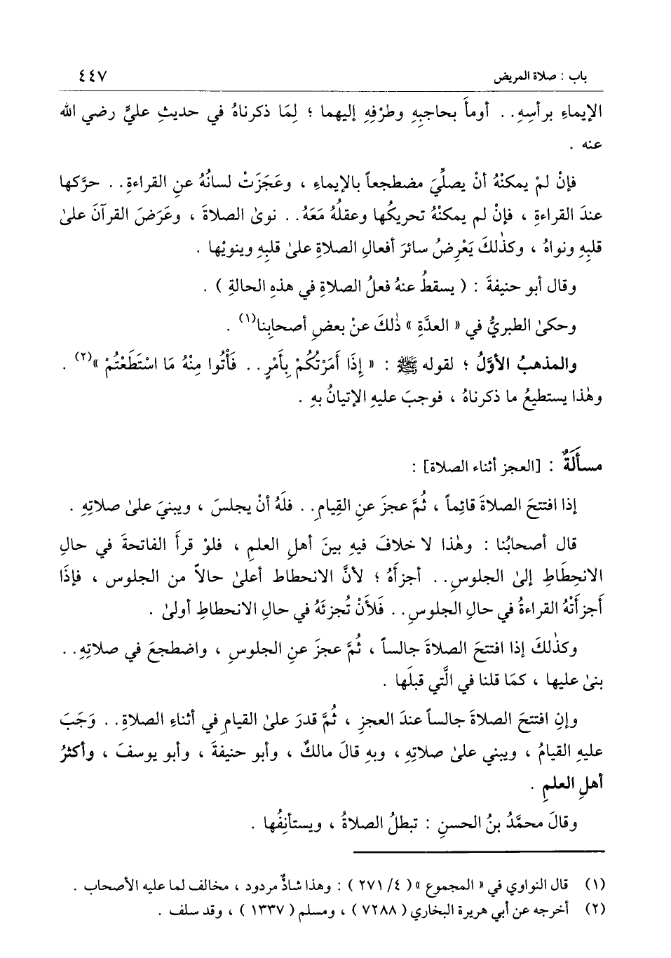 فإن لم يمكنه أن يصلي مضطجعًا بالإيماء، وعجزت لسانه عن القراءة حركها عند القراءة، فإن لم يمكنه تحريكها وعقله معه نوى الصلاة، وعرض القرآن على قلبه ونواه، وكذلك يعرض سائر أفعال الصلاة على قلبه وينويها.