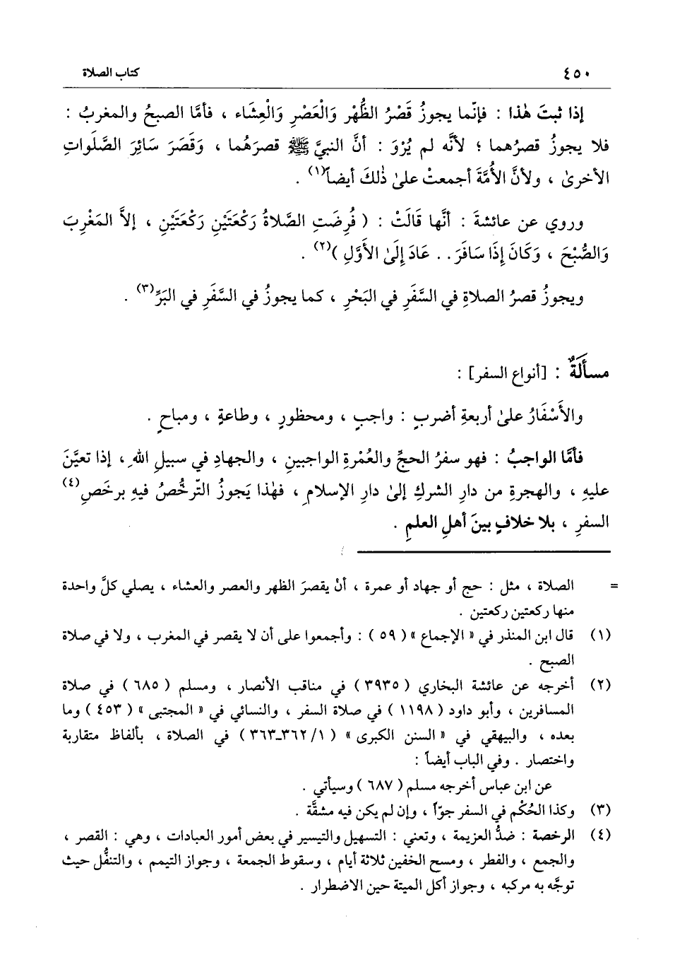 وروي عن عائشة: أنها قالت: (فرضت الصلاة ركعتين ركعتْين، إلا المغرب والصبح، وكان إذا سافر عاد إلى الأول) .