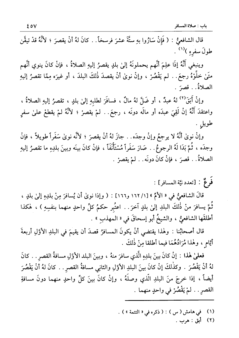قال الشافعي في "الأم" [1/162 و166] : (وإذا نوى أن يسافر من بلده إلى بلد، ثم يسافر من ذلك البلد إلى بلد آخر، اعتبر حكم كل واحد منهما بنفسه) ، هكذا أطلقها الشافعي، والشيخ أبو إسحاق في " المهذب".
