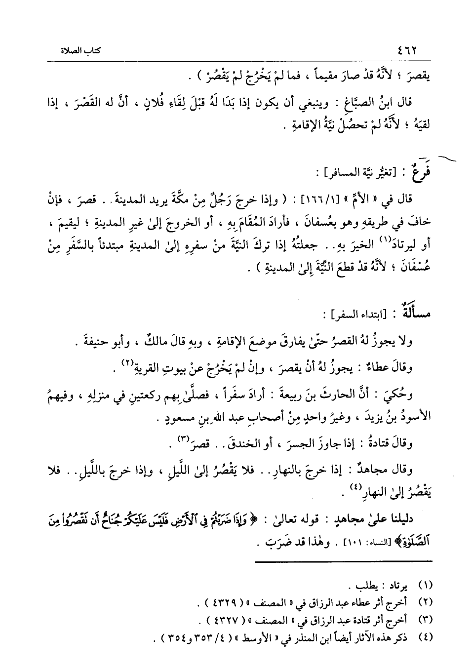 ] : قال في "الأم" [1/166] : (وإذا خرج رجل من مكة يريد المدينة قصر، فإن خاف في طريقه وهو بعسفان، فأراد المقام به، أو الخروج على غير المدينة ليقيم، أو ليرتاد الخير به جعلته إذا ترك النية من سفره إلى المدينة مبتدئًا بالسفر من عسفان؛ لأنه قد قطع النية إلى المدينة) .