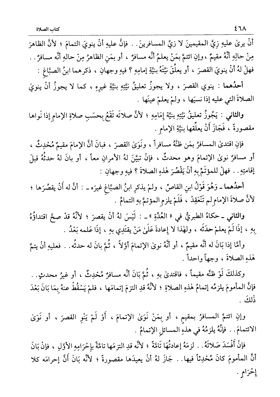 فإن اقتدى المسافر بمن ظنه مسافرًا، ونوى القصر، فبان أن الإمام مقيم محدث، أو مسافر نوى الإتمام وهو محدث، فإن تبين له الأمران معًا، أو بان له حدثه قبل إقامته، فهل للمؤتم به أن يقصر هذه الصلاة؟ فيه وجهان: