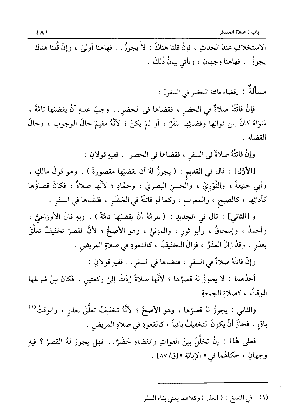 [مسألة قضاء فائتة الحضر في السفر]